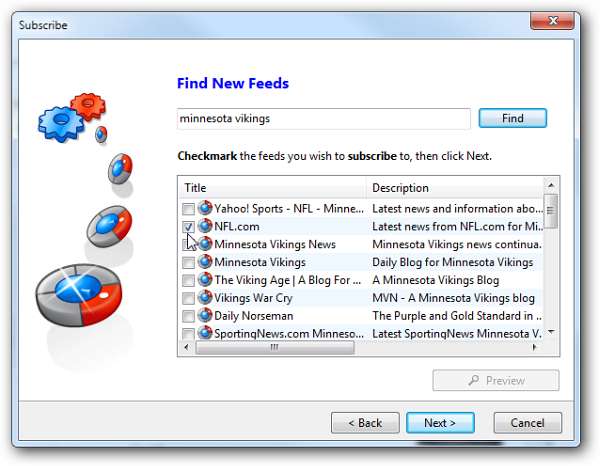 Etter å ha skrevet inn søkeord for å søke har du muligheten til å velge mellom flere søkemotorer, og resultatene vil komme opp med forskjellige feeder du kan legge til.