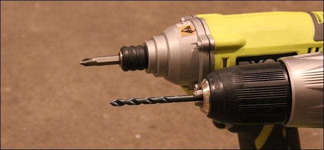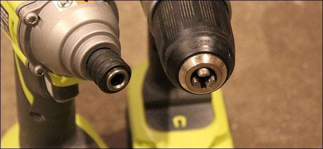 For det første bør slagdrivere virkelig ikke brukes til presis boring - kraftboret vil alltid gjøre en bedre jobb med det, siden du ikke vil ha en hammeraksjon når du borer. I tillegg har kraftbor en chuck, som er en enhet på enden av boret som består av klør som kan åpnes og lukkes for å akseptere alle forskjellige størrelser med borekroner. Slagdrivere har et hurtigskiftende hylse som bare aksepterer biter med 1/4-tommers sekskantskaft. Du kan finn bor med sekskantede skaft, men de er få og langt imellom.