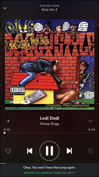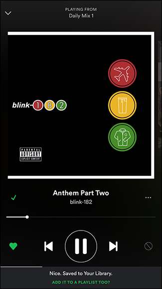 Når du lytter til et spor fra Daily Mix, har du to alternativer du vanligvis ikke får i Spotify. Trykk på hjertet for å lagre et spor i biblioteket ditt og fortell Spotify at det gjør godt; trykk på “nei” -tegnet for å forvise en sang og aldri høre den igjen.
