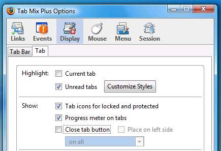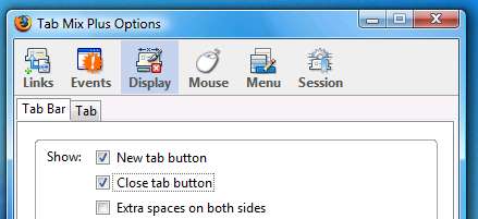 Hvis du har Tab Mix Plus installert, kan du gjøre nøyaktig det samme ved å åpne Tab Mix Plus-alternativene på Verktøy-menyen og velge Skjerm \ Tab. Her vil du sørge for at du fjerner merket for "Lukk faneknappen".