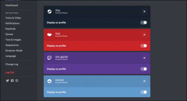 Siden Discord er "bygget for spillere", er det mange integrasjoner med spill og streamingtjenester. For å gjøre bruk av dem, må du først koble YouTube- og Twitch-kontoene dine til Discord. Du kan gjøre dette på "Tilkoblinger" -fanen under brukerinnstillingene dine. Du kan også legge til mange andre kontoer, for eksempel Steam- og sosiale mediekontoer.