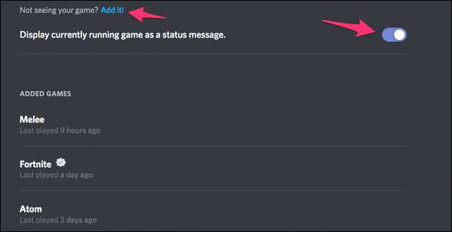 Game Display er en annen nyttig spillintegrasjon. Du har kanskje lagt merke til en tekstlinje under noen personers navn som sier "Spiller Spillnavn, ”Viser hvilket spill de spiller for øyeblikket. Du kan administrere innstillingene for dette i "Spill" -fanen i brukerinnstillingene. Hvis spillet ditt ikke oppdages automatisk, kan du legge det til manuelt fra en liste over apper som kjører. Du kan til og med endre navnet på spillet eller legge til apper som ikke er spill for å vises også.