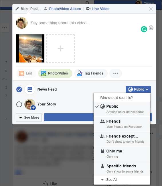 Du kan finjustere dette ved å angi personvernalternativer for individuelle innlegg. Hvis du for eksempel er innstilt på å legge ut offentlig på Facebook som standard, kan du fortsatt legge ut en privat video ved å klikke på rullegardinmenyen på det innlegget og velge et annet personvernalternativ.