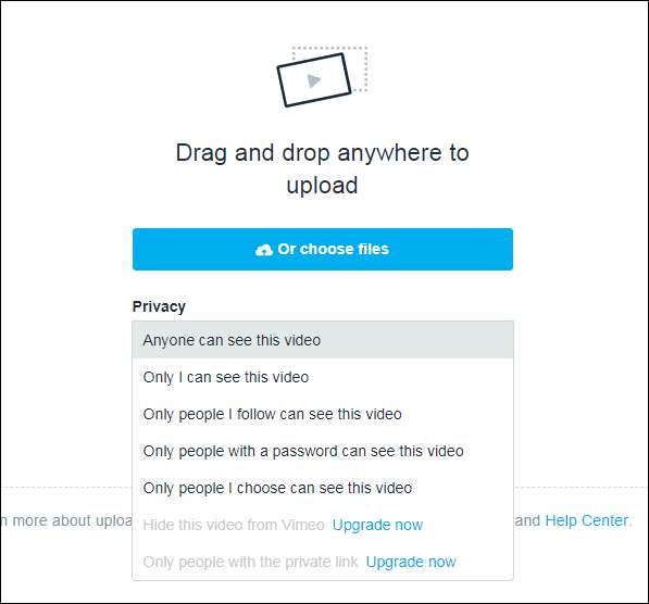 Vimeo støtter også personvernkontroller på opplastede videoer. Det er mange personvernalternativer, og de fleste av dem er tilgjengelige selv for gratis medlemmer, inkludert muligheten til å passordbeskytte videoene dine.