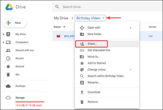 På alle skylagringsplattformer er ideen bak å organisere videoen din den samme. Du kan opprette en mappe, legge til videoene i den, og deretter dele mappen med menneskene du vil ha. Du kan dele individuelle filer, men å ha en mappe er nesten alltid bedre. Når det gjelder Google Drive, legger du til videoen din i en mappe og klikker deretter på rullegardinmenyen ved siden av mappenavnet for å se delingsalternativet.