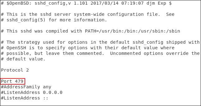 Fjern hash-nummeret fra starten av "Port" -linjen og erstatt "22" med portnummeret du velger. Lagre konfigurasjonsfilen og start SSH-demonen på nytt: