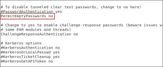 Bla gjennom filen til du ser linjen som heter "#PermitEmptyPasswords no." Fjern hasjen