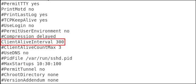 Det er mye tryggere å etablere en tidsavbruddsgrense. SSH-forbindelsen blir avbrutt hvis den inaktive perioden samsvarer med tidsfristen. Nok en gang redigerer vi SSH-konfigurasjonsfilen din: