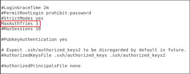 Å definere en grense for antall godkjenningsforsøk kan bidra til å hindre passordgissing og brutale kraftangrep. Etter det angitte antallet godkjenningsforespørsler, blir brukeren koblet fra SSH-serveren. Som standard er det ingen grense. Men det løses raskt.