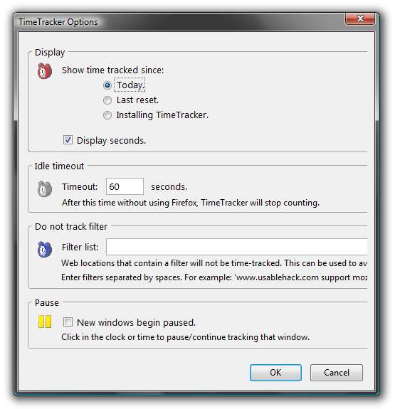 TimeTracker-utvidelsen for Firefox gir deg en veldig enkel måte å spore tiden du bruker rett foran nettleseren din. Timeren merker bare hvis du surfer, og du kan også ekskludere arbeidsrelaterte nettsteder fra tidtakeren.