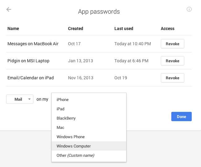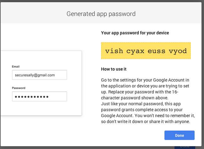 Disse kalles ofte applikasjonsspesifikke passord fordi du skal generere et nytt for hvert program du bruker. Derfor tillater Google og andre tjenester deg ikke å se disse applikasjonsspesifikke passordene når du har generert dem. De vises på nettstedet en gang, du skriver dem inn i applikasjonen, og så ser du ideelt sett aldri mer. Neste gang du trenger å bruke et slikt program, genererer du bare et nytt app-passord.