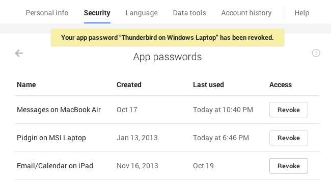Dette gir noen sikkerhetsfordeler. Når du er ferdig med et program, kan du bruke knappen her for å "tilbakekalle" et applikasjonsspesifikt passord, og passordet gir ikke lenger tilgang til kontoen din. Alle applikasjoner som bruker det gamle passordet, fungerer ikke. Apppassordet i skjermbildet nedenfor ble tilbakekalt, så det er derfor det er trygt å vise det frem.