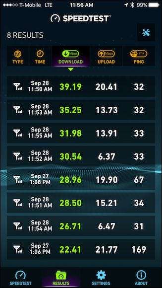 Husk at det er et gjennomsnitt. Farten din kan være raskere, eller den kan være tregere. Som du ser til høyre brukte jeg Speedtest-appen på min iPhone 6S (som er tilgjengelig også for Android ) på T-Mobile i Florida, og mine var mye høyere (om enn fremdeles langt under 100 Mbps).