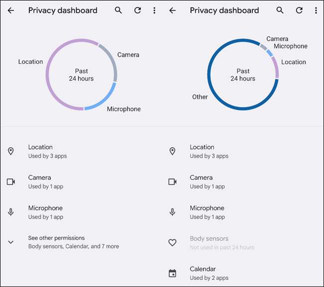 Når du åpner Privacy Dashboard som finnes i Innstillinger-menyen, ser du to forskjellige seksjoner. Vi starter med sirkelskjemaet øverst på skjermen. Dette diagrammet gir en rask og enkel måte å se hvilke tillatelser som er brukt mest i de siste 24 timene.