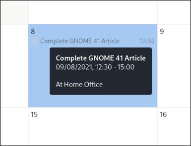 Kalenderen har en ny hendelse "pop over" dialog. Hvis du svinger over en kalenderhendelse, vil du se et verktøy-tipsoversikt over det.
