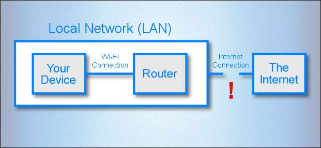 Så når enheten din har en Wi-Fi-tilkobling, er du koblet til et LAN. Men LAN-nettverket du er koblet til, er ikke nødvendigvis koblet til internett. Det er der problemet ligger. La oss se nærmere på det.