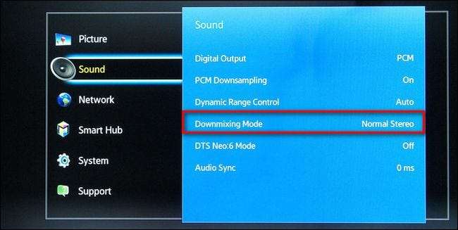 I skjermbildet ovenfor (av en Samsung BD H6500 Blu-ray-spiller), kan du se alternativet merket "Downmixing Mode" der du kan spesifisere hvordan du vil at Blu-ray-spilleren skal nedmixe lydkanalene for høyttalerkonfigurasjonen.