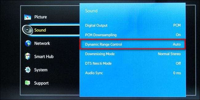 Ved å bruke den samme Samsung Blu-ray-spillermenyen kan du se alternativet ovenfor for “Dynamic Range Control”. Typiske alternativer er På, Av og Auto.