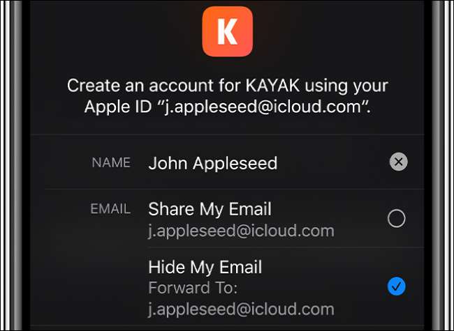 Hvis du er veldig opptatt av personvern, bør du ta en titt på det Logg på med Apple . Apple har snakket mye om personvern, men det er ikke bare snakk. Logg på Med Apple kan du skjule e-postadressen din - den genererer automatisk en unik, tilfeldig e-postadresse som videresendes til din vanlige e-postadresse. Tjenester får faktisk mindre informasjon om deg enn om du opprettet en egen konto med din vanlige e-postadresse. Det ville vært fint å se Google eller Facebook tilby noe slikt også.