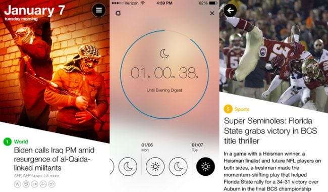 Søknaden fungerer som en avis, med et oppsummert utvalg av de viktigste nyhetshistoriene to ganger om dagen, klokka 8.00 og 18.00. Dette er ikke som Google Nyheter eller et hvilket som helst antall andre nettapper eller mobilapper som prøver å bruke algoritmer for å generere nyhetene dine for deg på farten. Yahoo News Digest er kuratert innhold, og det genereres som en enkelt utgave for hele USA (den er ikke tilgjengelig andre steder ennå).
