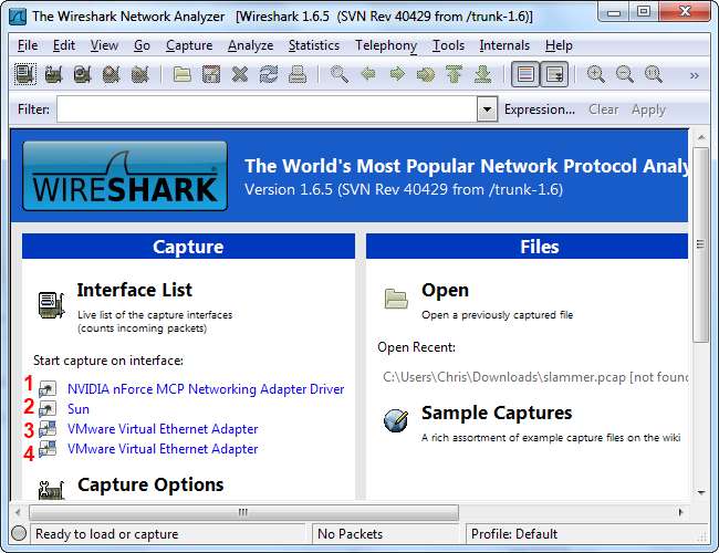 Możesz utworzyć specjalny skrót za pomocą argumentów wiersza poleceń Wirshark, jeśli chcesz rozpocząć przechwytywanie pakietów bez opóźnienia. Musisz znać numer interfejsu sieciowego, którego chcesz użyć, w oparciu o kolejność wyświetlania interfejsów przez Wireshark.