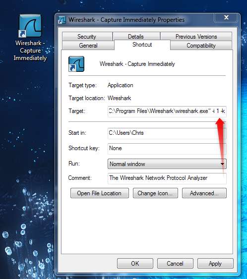 Utwórz kopię skrótu Wiresharka, kliknij go prawym przyciskiem myszy, przejdź do okna Właściwości i zmień argumenty wiersza poleceń. Dodaj -i # -k do końca skrótu, zastępując # z numerem interfejsu, którego chcesz użyć. Opcja -i określa interfejs, a opcja -k nakazuje Wireshark natychmiast rozpocząć przechwytywanie.
