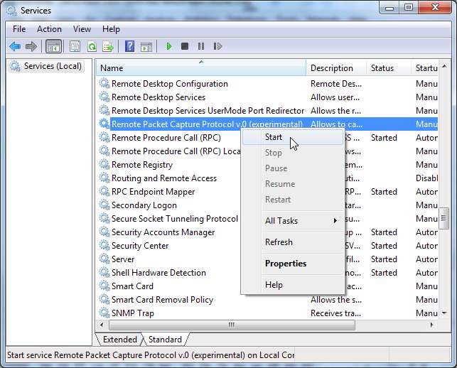 Po zainstalowaniu otwórz okno Usługi na komputerze zdalnym - kliknij Start, wpisz services.msc w polu wyszukiwania w menu Start i naciśnij Enter. Znajdź plik Protokół zdalnego przechwytywania pakietów usługi na liście i uruchom ją. Ta usługa jest domyślnie wyłączona.
