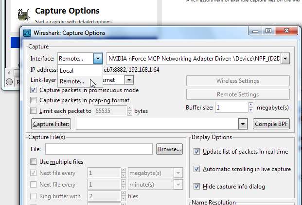 Kliknij Opcja przechwytywania s w programie Wireshark, a następnie wybierz Zdalny z pola interfejsu.