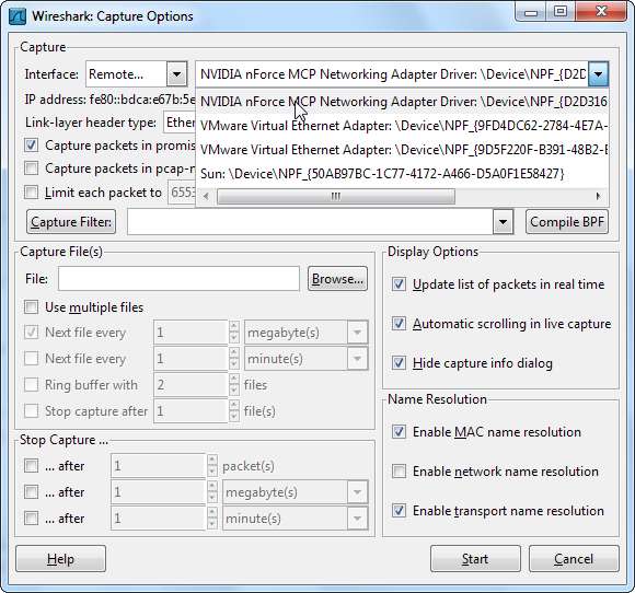 Po nawiązaniu połączenia możesz wybrać interfejs w systemie zdalnym z listy rozwijanej Interfejs. Kliknij Początek po wybraniu interfejsu, aby rozpocząć zdalne przechwytywanie.