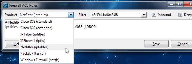 Użyj Produkt menu, aby wybrać typ zapory. Wireshark obsługuje Cisco IOS, różne typy zapór ogniowych Linux, w tym iptables i zaporę systemu Windows.
