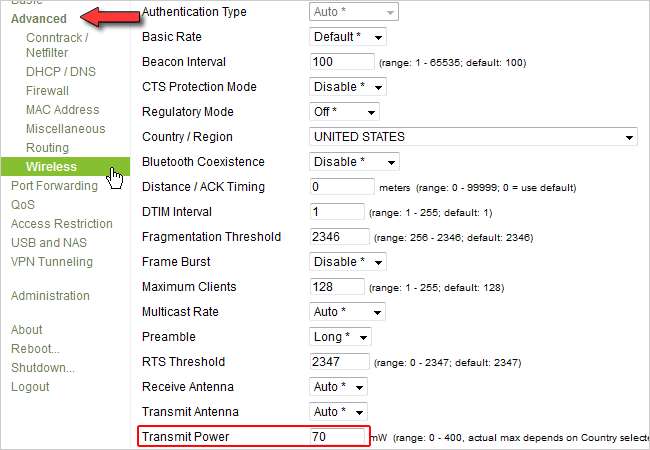 Aby rozpocząć, otwórz przeglądarkę internetową i przejdź do routera Tomato. Kliknij łącze Zaawansowane, a następnie Bezprzewodowa na lewym pasku bocznym. W dalszej części tej strony zauważysz sekcję „Moc transmisji”. Domyślna wartość dla pomidora to 42 mW (miliwatów). Maksymalna wartość obsługiwana przez Tomato to 251 mW, ale zalecamy, aby nie przekraczać 70 mW, chyba że chcesz ryzykować przegrzanie routera o znacznie krótkiej żywotności.