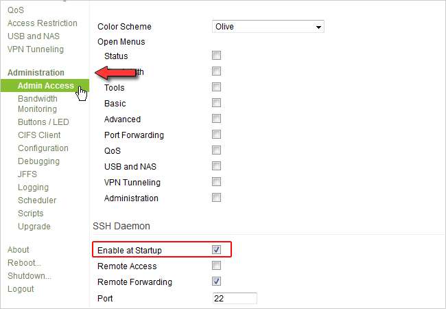 Brzmi dobrze, prawda? Wszystko, co musisz zrobić, to włączyć dostęp SSH na routerze i uruchomić trzy proste polecenia. Najpierw zaloguj się do routera i kliknij łącze Administracja na pasku bocznym. Przewiń w dół, aż zobaczysz „SSH Daemon”. Upewnij się, że zaznaczona jest opcja „Włącz przy uruchomieniu”. Przewiń w dół, aż zobaczysz „Hasło”. Wpisz hasło dostępu przez SSH, a następnie kliknij Zapisz u dołu.