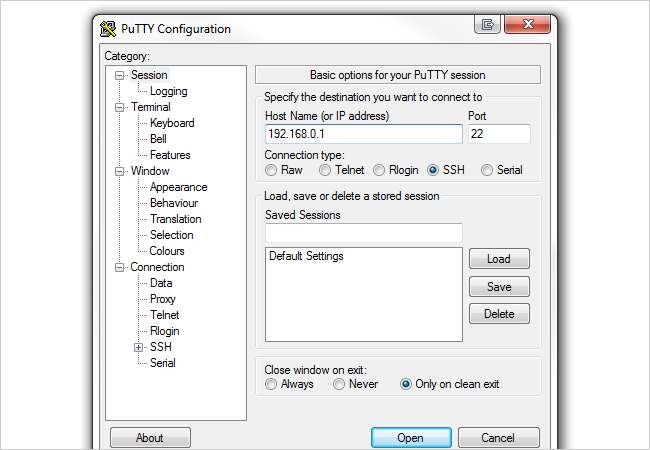 Teraz, gdy mamy włączony dostęp SSH na naszym routerze, pobierzmy program, który pozwoli nam uzyskać dostęp do naszego routera przez SSH. Sugerujemy użycie Kit dla systemu Windows i wbudowanych aplikacji terminalowych dla użytkowników komputerów Mac i Linux. W tym przykładzie będziemy używać PuTTY w systemie Windows. Wpisz adres IP routera i upewnij się, że w obszarze Typ połączenia wybrano opcję SSH. Kliknij przycisk Otwórz.