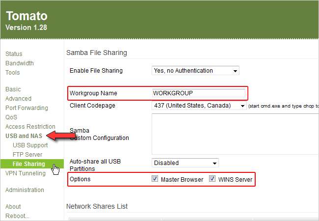 Następnie kliknij łącze USB i NAS na pasku bocznym. Kliknij łącze podrzędne Udostępnianie plików. Upewnij się, że nazwa Twojej grupy roboczej ma taką samą nazwę dla wszystkich urządzeń w sieci. Następnie zaznacz oba pola obok „Przeglądarka główna” i „Serwer WINS”. Kliknij Zapisz u dołu.