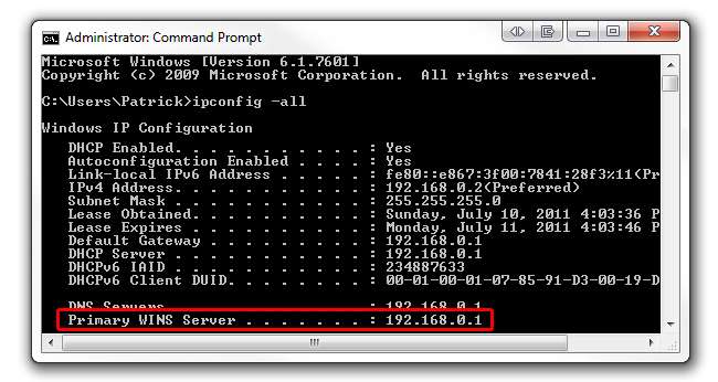 Teraz upewnijmy się, że nasz komputer faktycznie korzysta z serwera WINS, który właśnie skonfigurowaliśmy. Śmiało i otwórz wiersz poleceń i wpisz „ipconfig –all”. Być może będziesz musiał przewinąć w dół, aby zobaczyć aktualną kartę sieciową, ale kiedy szukasz wiersza z napisem „Podstawowy serwer WINS”. Obok powinien być adres IP routera. Jeśli nie widzisz adresu IP routera, spróbuj ponownie uruchomić komputer i ponownie uruchomić polecenie. Czasami serwer WINS nie aktualizuje się, dopóki nowy adres IP nie zostanie odnowiony z serwera DHCP.