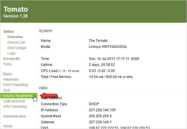 Aby rozpocząć, zaloguj się do routera Tomato i kliknij link Ograniczenie dostępu na lewym pasku bocznym.