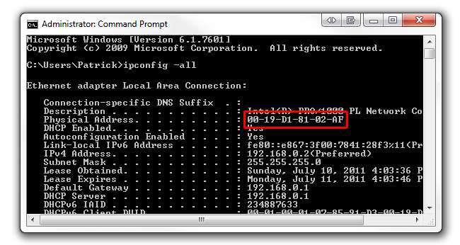 Obok „Dotyczy” chcemy kliknąć menu i wybrać „Następujące”. Zauważysz, że Tomato pyta Cię o adres MAC lub adres IP komputera, do którego chcesz ograniczyć dostęp. Jeśli Twój komputer nie jest skonfigurowany do posiadania statycznego adresu IP , w celu zapewnienia niezawodności najlepiej jest wprowadzić adres MAC komputera. Aby znaleźć adres MAC komputera w systemie Windows, otwórz wiersz polecenia i wpisz „ipconfig –all”. Ciąg 12 znaków obok „Adres fizyczny” to adres MAC komputera. Wpisz to w Tomato bez myślników (Pomidor automatycznie doda średniki między każdą drugą wartością) i kliknij przycisk „Dodaj” poniżej.