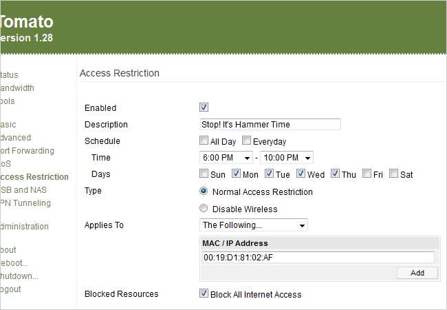 Ograniczenie dostępu nigdy nie wydaje się dobrą rzeczą, ale dzieje się tak, gdy próbujesz wykonać pracę lub chcesz odstraszyć określone osoby od określonych części sieci. Funkcja ograniczenia dostępu Tomato umożliwia administratorowi tworzenie reguł dla Twojej sieci. W poniższym przykładzie ustawimy regułę, która ograniczy nam przechodzenie do określonych witryn internetowych, które powodują, że nie wykonujemy żadnej pracy. Zasada ta będzie obowiązywać w dni powszednie od 18:00 do 22:00.