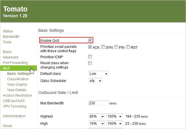 Pierwszym krokiem jest ustawienie naszych klas prędkości, które określają, które protokoły / ruch uzyskują największą lub najmniejszą przepustowość. Kliknij QoS na pasku bocznym, a następnie Ustawienia podstawowe. Zaznacz „Włącz QoS”, aby aktywować pozostałe opcje poniżej.