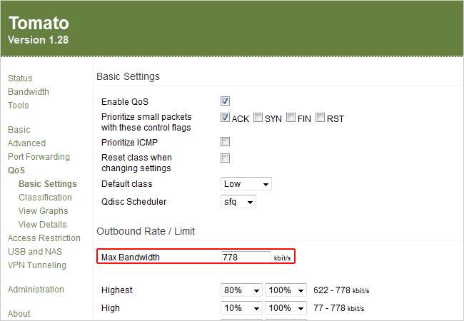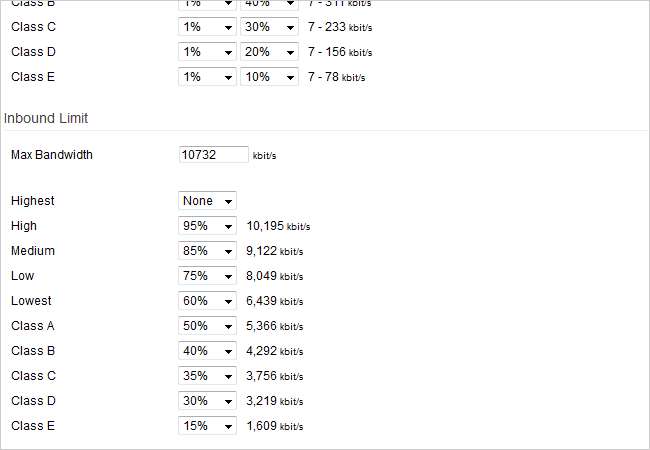 Zwróćmy teraz uwagę na szybkość pobierania z naszego wcześniejszego testu szybkości. Zamień to na kilobity na sekundę i wpisz w polu „Maksymalna przepustowość” pod „Limit ruchu przychodzącego”. Tym razem Tomato nie wykona swojej magii i nie dostosuje poniższych klas szybkości, więc będziemy musieli zrobić to ręcznie. Możesz użyć klas szybkości, których użyliśmy poniżej, lub skonfigurować je specjalnie dla swojego środowiska (co zalecamy). Te ustawienia działają dla nas w naszym środowisku. Kliknij Zapisz u dołu strony.