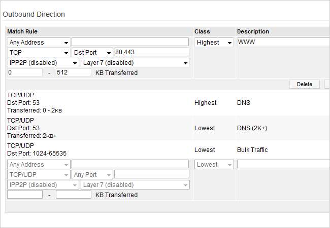 Pomaga to, aby strona Klasyfikacja i strona Ustawienia podstawowe były otwarte w dwóch oddzielnych zakładkach w celach informacyjnych. Pierwszą regułą i prawdopodobnie najważniejszą, jaką ustawiliśmy, był ruch WWW. Teraz Tomato wykonuje dobrą robotę, ustawiając tę regułę domyślnie, więc nie musimy zbyt wiele poprawiać. Ta reguła nadaje najwyższy priorytet (między 622 - 778 kbit / s w naszej konfiguracji) ruchowi wychodzącemu, który przechodzi przez porty 80 (HTTP) i 443 (HTTPS). Aby ruch był przepychany przez tę klasę, nie może przekraczać 512 KB danych przesyłanych wychodzących (upload). Pomaga to zapewnić, że przesyłane duże pliki (takie jak kopiowanie pliku wideo .mkv 4 GB do Dropbox) nie mieszczą się w tej klasie i nie obciążają całej naszej przepustowości.