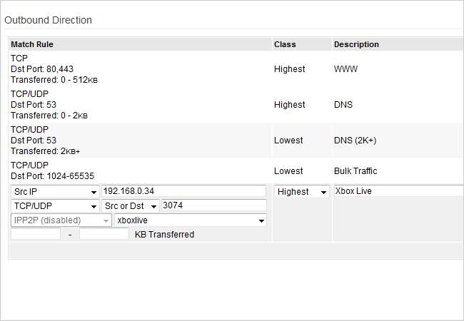 Ustawimy jeszcze jedną bardzo bliską nam zasadę: Xbox Live. Najpierw ustawimy źródłowy adres IP na statyczny adres IP naszej konsoli Xbox: 192.168.0.34. Następnie nadamy priorytet ruchowi o najwyższym priorytecie. Usługa Xbox Live używa portu 3074, więc każdy ruch pochodzący z adresu do adresu 192.168.0.34:3074 będzie należał do tej klasy. Na wszelki wypadek ustawiliśmy również nasz filtr L7 (Layer 7) na „xboxlive”. Uważaj, dodając zbyt wiele filtrów L7 do wielu klas, ponieważ może to spowodować przeciążenie routera.