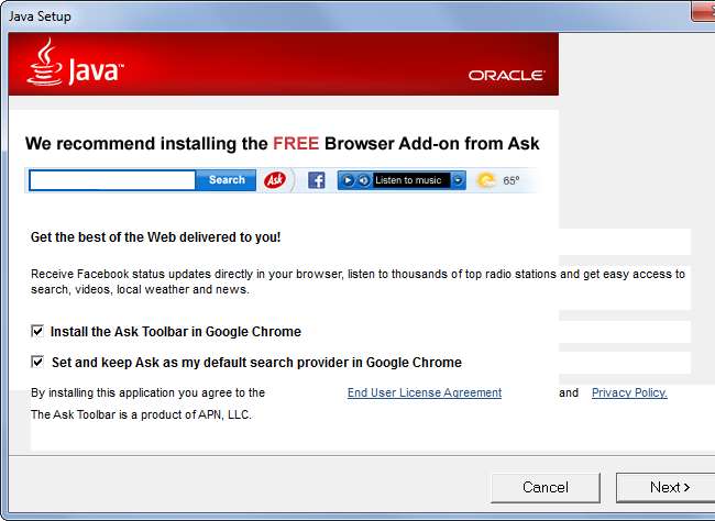 Wtyczka Oracle Java próbuje nawet zainstalować straszny pasek narzędzi Ask podczas instalowania aktualizacji zabezpieczeń. Zgadza się - proces aktualizacji zabezpieczeń jest również używany do wtłaczania dodatkowego oprogramowania reklamowego do komputerów użytkowników, więc pozbawione skrupułów firmy, takie jak Oracle, mogą szybko zarobić. Nic dziwnego, że na większości komputerów z systemem Windows jest zainstalowana nieaktualna, podatna na ataki wersja oprogramowania Java.
