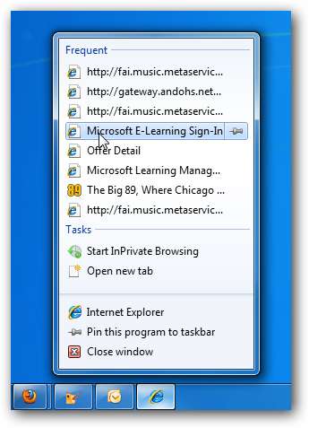 Aby uzyskać dostęp do list szybkiego dostępu, kliknij prawym przyciskiem myszy ikonę programu na pasku zadań, tak jak w tym przykładzie przeglądarki Internet Explorer. Zauważ też, że możesz przypiąć te elementy do paska zadań, jeśli chcesz.