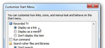 Po pierwsze, przejdź do panelu Dostosuj menu Start, klikając prawym przyciskiem myszy menu Start i używając Właściwości, a następnie upewnij się, że Nagrana telewizja jest ustawiona na „Wyświetlaj jako łącze”.