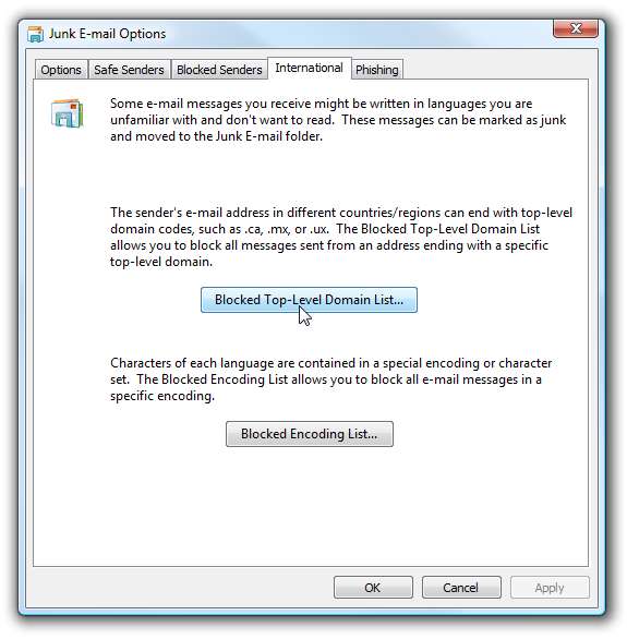 Aby zablokować wszystkie wiadomości spamowe przed trafieniem do skrzynki odbiorczej, otwórz Pocztę systemu Windows i przejdź do elementu Narzędzia \ Opcje wiadomości-śmieci. Kliknij kartę Międzynarodowe, a powinieneś zobaczyć ten ekran: