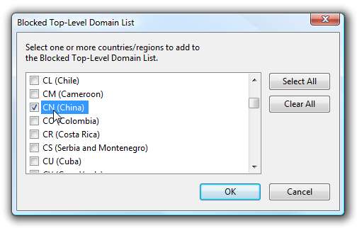 Istnieją dwa oddzielne sposoby blokowania spamu międzynarodowego: Po pierwsze, możesz zablokować same domeny, wybierając je tutaj. Jeśli wybierzesz opcję Wybierz wszystko, powinieneś zostać ostrzeżony, że .US również znajduje się na tej liście.