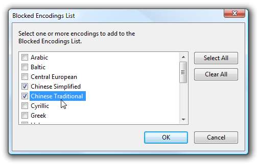 Możesz także zablokować kodowanie wiadomości. Zablokowałem wszystkie azjatyckie kodowania wiadomości, ponieważ zdecydowanie nie potrafię odczytać tych języków, a około 1/10 otrzymywanego obecnie spamu jest zakodowana w jednym z tych typów. Ponownie, zachowaj ostrożność, wybierając opcję Wybierz wszystko, w przeciwnym razie zablokujesz wszystkie wiadomości e-mail od wszystkich.