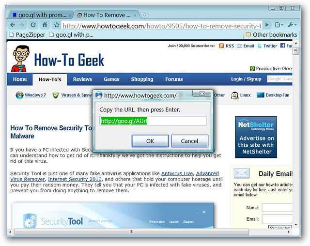 Wspaniałą rzeczą w tym bookmarkletu jest małe wyskakujące okienko, które zapewnia łatwy sposób kopiowania skróconego adresu URL.