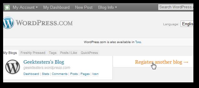 P2 działa znacznie inaczej niż standardowe motywy WordPress, więc prawdopodobnie nie będziesz chciał go używać w swojej witrynie głównej, ale zamiast tego będziesz chciał go użyć w osobnym projekcie. Jeśli masz już blog WordPress.com, ale wolisz, aby był taki, jaki jest, przejdź do Moje blogi na WordPress.com i kliknij Zarejestruj innego bloga . W ten sposób otrzymasz zupełnie nowy blog, z którego możesz korzystać bezpłatnie w P2.